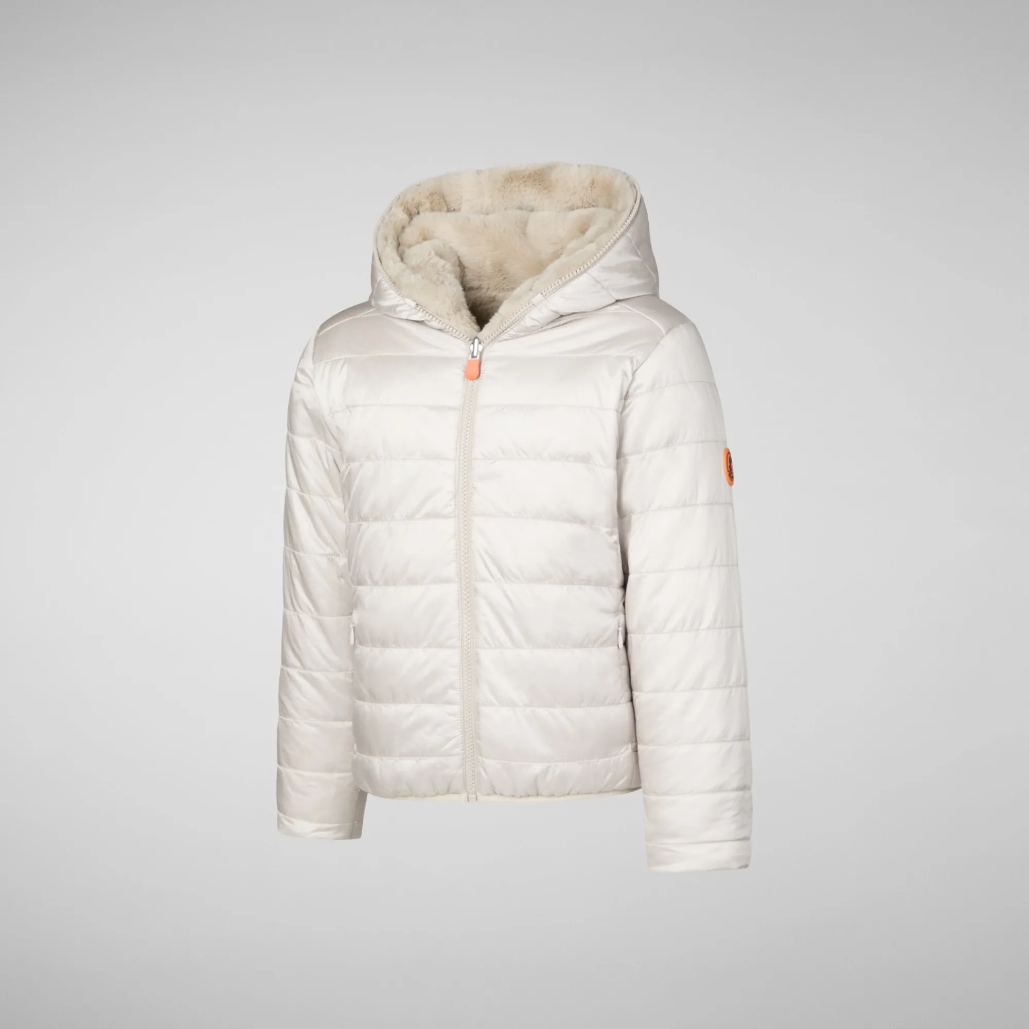 Chloe is a reversible hooded jacket that offers your little girl two options: one quilted side and another in a plush faux fur made from recycled polyester. It features a central zipper, invisible zipped pockets, and Lycra trims at the hem and cuffs. The round Save The Duck logo on the sleeve provides a fun signature.